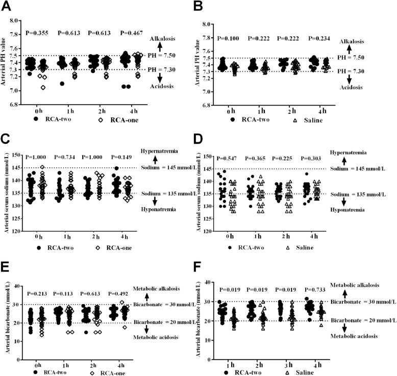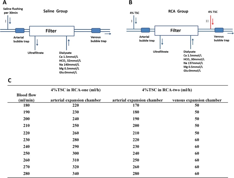 Results: Serious clotting events in the RCA-two group were significantly lower compared with the RCA-one and saline group (7.89% vs. 30.77%, P = 0.011; 3.03% vs. 54.84%, P < 0.001, respectively). The median circuit survival time was 240 min (IQR 240 to 240) in the RCA-two group, was significantly longer than 230 min (IQR 155 to 240, P < 0.001) in the RCA-one group and 210 min (IQR 135 to 240, P = 0.003) in the saline group. The majority of the AEs were hypotension, hypoglycemia and chest tightness, most of which were mild in intensity. Eight patients (20.51%) in the RCA-one group, 4 patients (12.90%) in the saline group and 10 patients (26.31%) in the RCA-two group, P > 0.05.