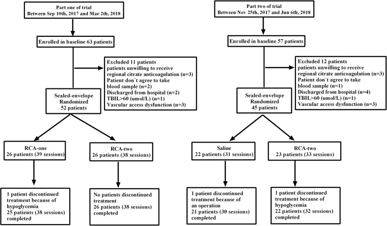 Method: In this investigator-initiated, multicenter, controlled, prospective, randomized clinical trial, 52 HD patients (77 sessions) were randomized to the RCA-2 and RCA-one group in part one of the trial, and 45 patients (64 sessions) were randomized to the RCA-2 and saline group in part two of the trial. Serious clotting events, adverse events and blood analyses were recorded.
