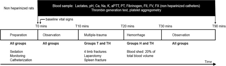 Method: Four groups of 15 rats were compared: C, control; T, trauma; H, hemorrhage; and TH, trauma and hemorrhage. Blood samples were drawn at baseline and 90 min. Thrombin generation tests, platelet aggregometry, and standard hemostasis tests were performed.