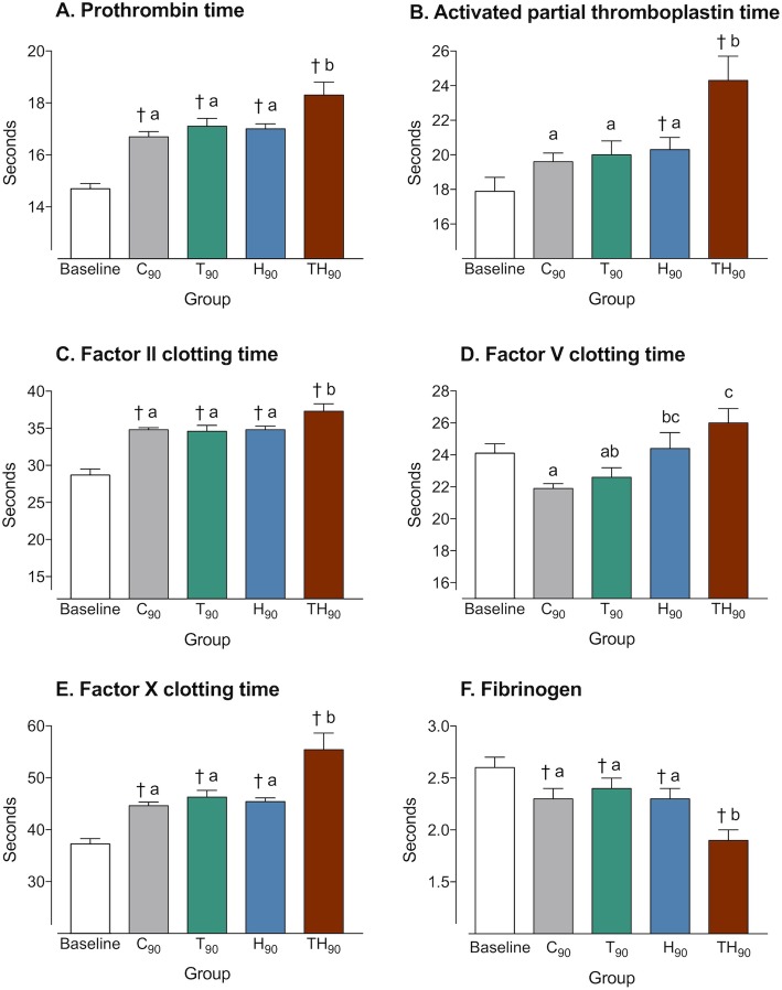 Results: Significant differences were observed between the baseline and TH groups for aPTT (17.9 ± 0.8 s vs 24.3 ± 1.4 s, p < 0.001, mean ± SEM), MAP (79.7 ± 1.3 mmHg vs 43.8 ± 1.3 mmHg, p < 0.001, mean ± SEM), and hemoglobin (16.5 ± 0.1 g/dL vs 14.1 ± 0.3 g/dL, p < 0.001, mean ± SEM), indicating the presence of an hemorrhagic shock due to ATC. Compared to all other groups, coagulation factor activities were decreased in the TH group, but endogenous thrombin potential was (paradoxically) higher than in group C (312 ± 17 nM/min vs. 228 ± 23 nM/min; p = 0.016; mean ± SEM). We also observed a subtle decrease in platelet count and function in case of ATC and retrieved an inversed linear relationship between fibrinogen concentration and aPTT (intercept, 26.53 ± 3.16; coefficient, - 3.40 ± 1.26; adjusted R2: 0.1878; p = 0.0123).