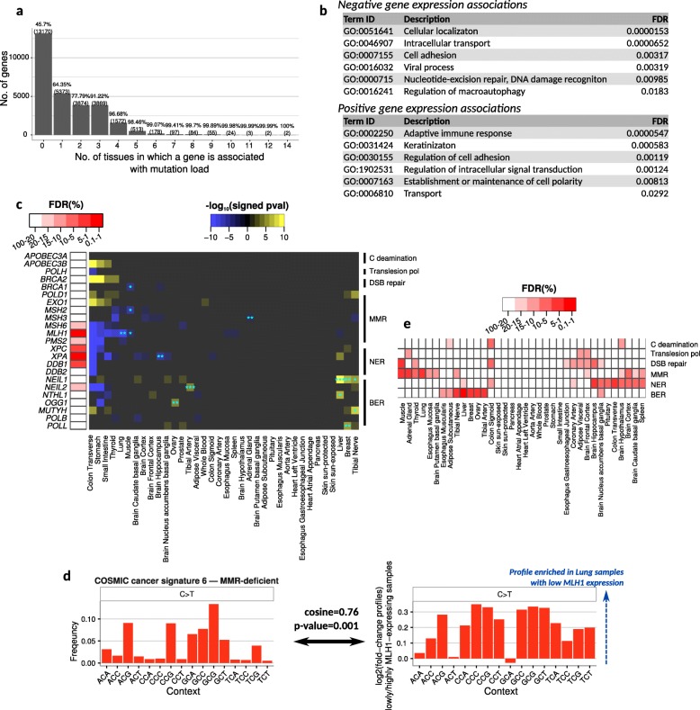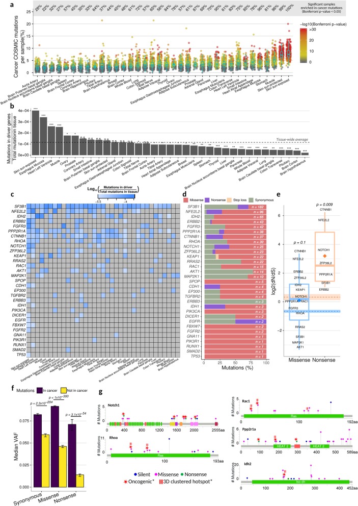 Results: To gain a better understanding of the genome-wide distribution and functional impact of somatic mutations, we leverage the genomic information contained in the transcriptome to uniformly call somatic mutations from over 7500 tissue samples, representing 36 distinct tissues. This catalog, containing over 280,000 mutations, reveals a wide diversity of tissue-specific mutation profiles associated with gene expression levels and chromatin states. For example, lung samples with low expression of the mismatch-repair gene MLH1 show a mutation signature of deficient mismatch repair. In addition, we find pervasive negative selection acting on missense and nonsense mutations, except for mutations previously observed in cancer samples, which are under positive selection and are highly enriched in many healthy tissues.