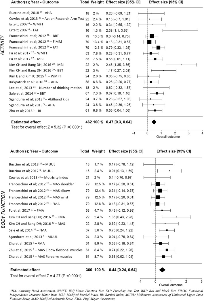 Methods: Seven electronic databases (Cochrane, EBSCO, Embase, Eric, PubMed, Scopus and Web of Science) were searched up to 16 September 2018 to select Randomized Controlled Trials focused on adults and children with brain damage that included AOT training on upper and/or lower limb carried out for at least 1 week. Identification of studies and data extraction was conducted with two reviewers working independently. Oxford Centre for Evidence-based Medicine (March2009) - Levels of Evidence and Physiotherapy Evidence Database scale were used to grade studies. The data collected from the articles were analysed using software R, version 3.4.3. Hedge's g values were calculated and effect size estimates were pooled across studies. Separate meta-analyses were carried out for each ICF domain (i.e. body function and activity) for upper and lower limb.