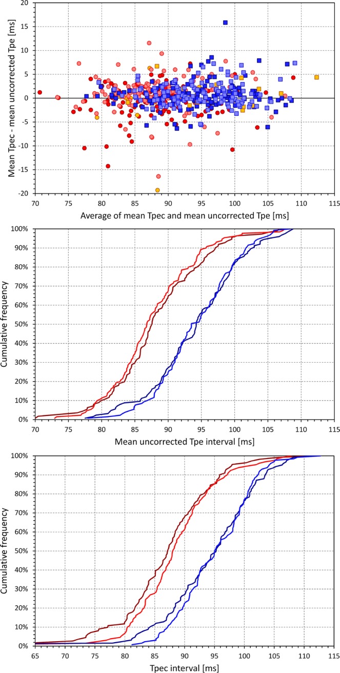 To facilitate the precision of clinical electrocardiographic studies of J-to-Tpeak (JTp) and Tpeak-to-Tend (Tpe) intervals, the study investigated their differences between healthy females and males, and between subjects of African and Caucasian origin. In 523 healthy subjects (254 females; 236 subjects of African origin), repeated Holter recordings were used to measure QT, JT, JTp, and Tpe intervals preceded by both stable and variable heart rates. Subject-specific curvilinear regression models were used to obtain individual QTc, JTc, JTpc and Tpec intervals. Rate hysteresis, i.e., the speed with which the intervals adapted after heart rate changes, was also investigated. In all sex-race groups, Tpe intervals were not systematically heart rate dependent. Similar to QTc intervals, women had JTc, and JTpc intervals longer than males (difference 20-30 ms, p < 0.001). However, women had Tpec intervals (and rate uncorrected Tpe intervals) shorter by approximately 10 ms compared to males (p < 0.001). Subjects of African origin had significantly shorter QTc intervals than Caucasians (p < 0.001). Gradually diminishing race-difference was found for JTc, JTpc and Tpec intervals. JTc and JTpc were moderately increasing with age but Tpe/Tpec were not. Rate hysteresis of JTp was approximately 10% longer compared to that of JT (p < 0.001). In future clinical studies, Tpe interval should not be systematically corrected for heart rate and similar to the QT interval, the differences in JT, JTp and Tpe intervals should be corrected for sex. The differences in QT and JT, and JTp intervals should also be corrected for race.
