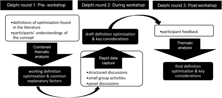 Methods: We used a modified, three-round Delphi study with an international group of researchers, public health policy-makers and practitioners to (1) generate a consensus-based definition of optimisation in the context of public health and (2i) describe key considerations for optimisation in that context. A pre-workshop literature review and elicitation of participant views regarding optimisation in public health (round 1) were followed by a daylong workshop and facilitated face-to-face group discussions to refine the definition and generate key considerations (round 2); finally, post-workshop discussions were undertaken to refine and finalise the findings (round 3). A thematic analysis was performed at each round. Study findings reflect an iterative consultation process with study participants.