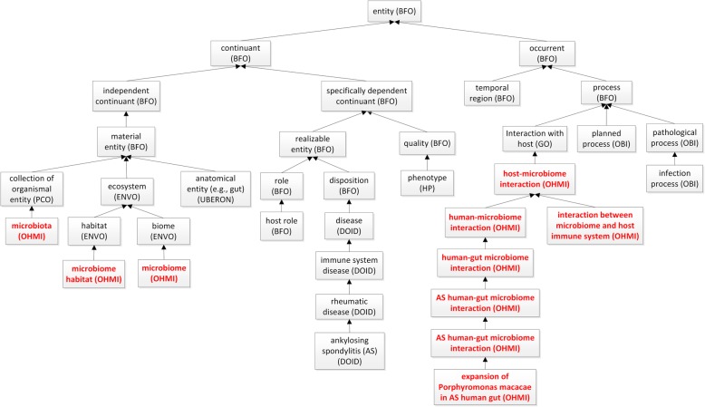 Methods: Through a multi-institutional collaboration, a community-based Ontology of Host-Microbiome Interactions (OHMI) was developed following the Open Biological/Biomedical Ontologies (OBO) Foundry principles. As an OBO library ontology, OHMI leverages established ontologies to create logically structured representations of (1) microbiomes, microbial taxonomy, host species, host anatomical entities, and HMIs under different conditions and (2) associated study protocols and types of data analysis and experimental results.