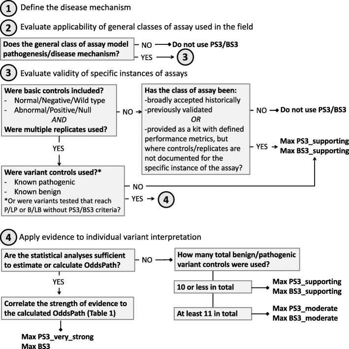 Results: The SVI Working Group developed recommendations for evaluators regarding the assessment of the clinical validity of functional data and a four-step provisional framework to determine the appropriate strength of evidence that can be applied in clinical variant interpretation. These steps are as follows: (1) define the disease mechanism, (2) evaluate the applicability of general classes of assays used in the field, (3) evaluate the validity of specific instances of assays, and (4) apply evidence to individual variant interpretation. We found that a minimum of 11 total pathogenic and benign variant controls are required to reach moderate-level evidence in the absence of rigorous statistical analysis.