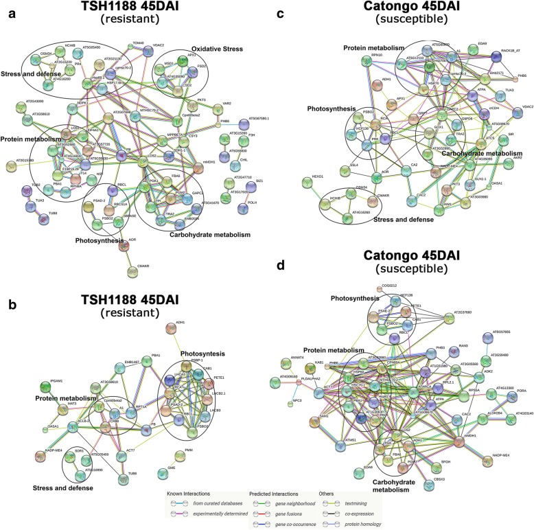 Results: A total of 554 proteins were identified, being 246 in the susceptible Catongo and 308 in the resistant TSH1188 genotypes. The identified proteins were involved mainly in metabolism, energy, defense and oxidative stress. The resistant genotype showed more expressed proteins with more variability associated with stress and defense, while the susceptible genotype exhibited more repressed proteins. Among these proteins, stand out pathogenesis related proteins (PRs), oxidative stress regulation related proteins, and trypsin inhibitors. Interaction networks were predicted, and a complex protein-protein interaction was observed. Some proteins showed a high number of interactions, suggesting that those proteins may function as cross-talkers between these biological functions.
