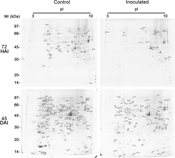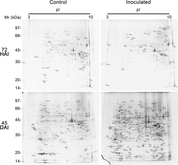 Background: Witches' broom disease (WBD) of cacao (Theobroma cacao L.), caused by Moniliophthora perniciosa, is the most important limiting factor for the cacao production in Brazil. Hence, the development of cacao genotypes with durable resistance is the key challenge for control the disease. Proteomic methods are often used to study the interactions between hosts and pathogens, therefore helping classical plant breeding projects on the development of resistant genotypes. The present study compared the proteomic alterations between two cacao genotypes standard for WBD resistance and susceptibility, in response to M. perniciosa infection at 72 h and 45 days post-inoculation; respectively the very early stages of the biotrophic and necrotrophic stages of the cacao x M. perniciosa interaction.