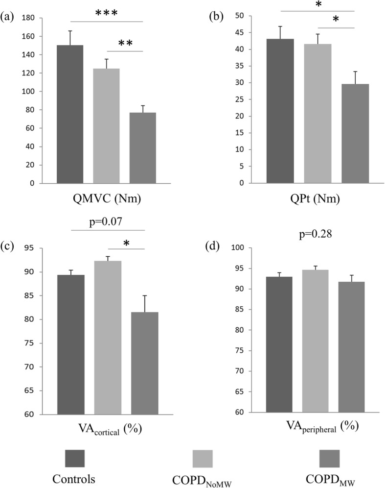 Results: COPDMW exhibited lower VAcortical and lower MEP/Mmax compared with COPDNoMW (p < 0.05). Hmax/Mmax was not significantly different between groups (p = 0.25). Silent period duration was longer in the two groups of COPD patients compared with controls (p < 0.01). Interestingly, there were no significant differences between all COPD patients taken together and controls regarding VAcortical and MEP/Mmax.