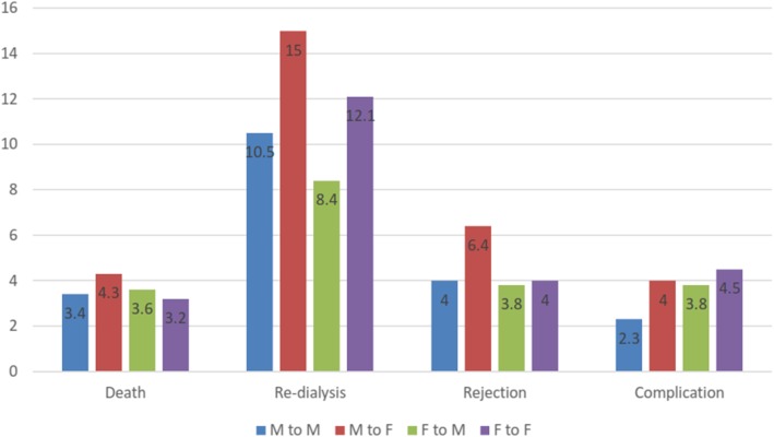 Conclusions: Our results suggested gender matching for kidney transplant. Only in some exceptional conditions, male donor to female recipient kidney transplant may be successful and female donors to male recipients are not suggested, especially in aged patients with the history of dialysis.