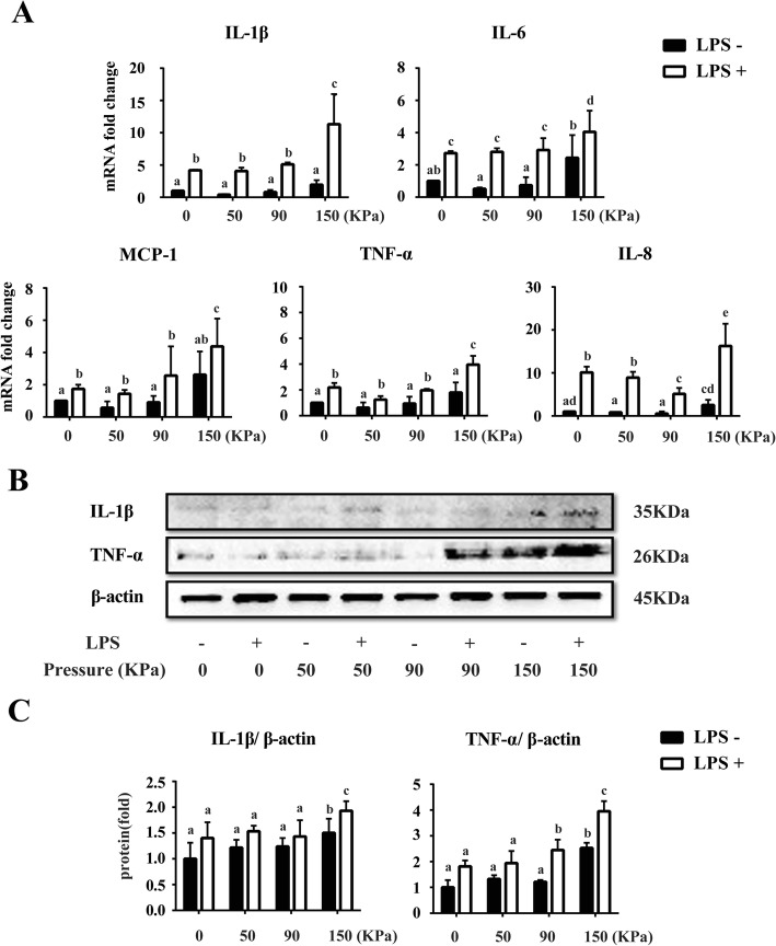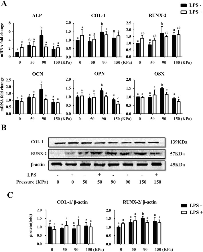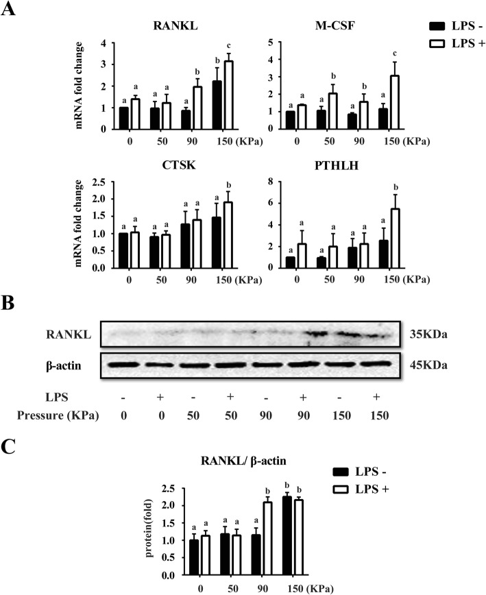Results: MTT and RT-PCR results showed that 10 μg/ml LPS up-regulated TNF-α, IL-1β, IL-6, IL-8 and MCP-1 mRNA levels (P < 0.05) and did not affect the cell viability (P > 0.05). The excessive loading of stress (150 kPa) with or without LPS strongly increased the expression of inflammatory-related markers TNF-α, IL-1β, IL-6, IL-8, MCP-1 (P < 0.05) and osteoclastic markers RANKL, M-CSF, PTHLH and CTSK compared with other groups (P < 0.05), but had no significant effect on osteogenic genes. While 0-90 kPa cyclic pressure could up-regulate the expression of osteogenic genes ALP, COL-1, RUNX2, OCN, OPN and OSX in the healthy hPDLSCs.