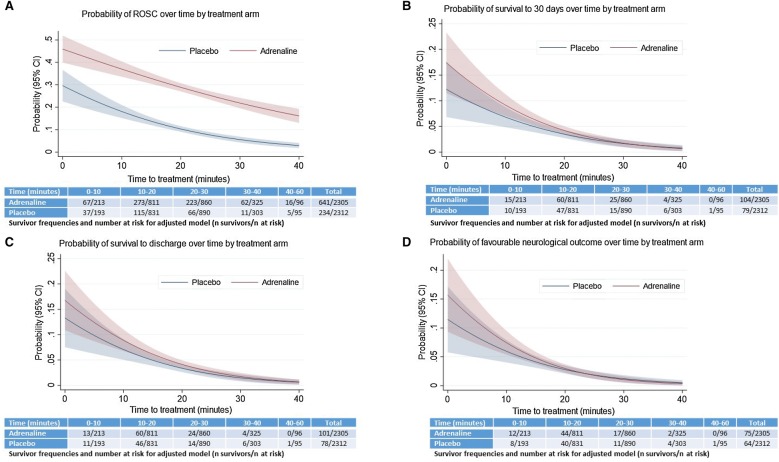 Results: 8016 patients were enrolled, 4902 sustained a witnessed cardiac arrest of whom 2437 received placebo and 2465 received adrenaline. The odds of return of spontaneous circulation decreased in both groups over time but at a greater rate in the placebo arm odds ratio (OR) 0.93 (95% CI 0.92-0.95) compared with the adrenaline arm OR 0.96 (95% CI 0.95-0.97); interaction OR: 1.03, 95% CI 1.01-1.05, p = 0.005. By contrast, although the rate of survival and favourable neurological outcome decreased as time to treatment increased, the rates did not differ between the adrenaline and placebo groups.