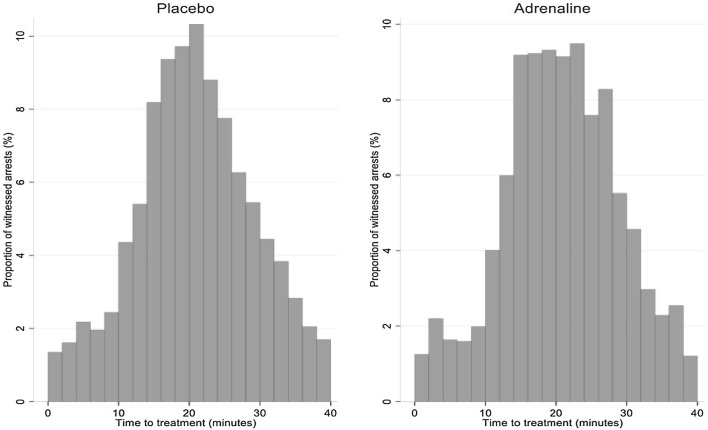 Purpose: To examine the time to drug administration in patients with a witnessed cardiac arrest enrolled in the Pre-Hospital Assessment of the Role of Adrenaline: Measuring the Effectiveness of Drug Administration in Cardiac Arrest (PARAMEDIC2) randomised controlled trial.