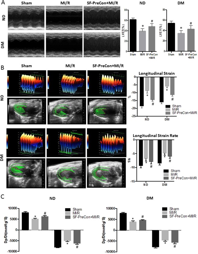 Diabetes mellitus (DM) significantly increases myocardial ischemia/reperfusion (MI/R) injury. During DM, cardioprotection induced by conventional pre-conditioning (PreCon) is decreased due to impaired AMP-activated protein kinase (AMPK) signaling. The current study investigated whether PreCon with inhaled anesthetic sevoflurane (SF-PreCon) remains cardioprotective during DM, and identified the involved mechanisms. Normal diet (ND) and high-fat diet (HFD)-induced DM mice were randomized into control and SF-PreCon (3 cycles of 15-minute period exposures to 2% sevoflurane) groups before MI/R. SF-PreCon markedly reduced MI/R injury in DM mice, as evidenced by improved cardiac function (increased LVEF and ±Dp/dt), decreased infarct size, and decreased apoptosis. To determine the relevant role of AMPK, the effect of SF-PreCon was determined in cardiac-specific AMPKα2 dominant negative expressing mice (AMPK-DN). SF-PreCon decreased MI/R injury in AMPK-DN mice. To explore the molecular mechanisms responsible for SF-PreCon mediated cardioprotection in DM mice, cell survival molecules were screened. Interestingly, in ND mice, SF-PreCon significantly reduced MI/R-induced activation of p38, a pro-death MAPK, without altering ERK and JNK. In DM and AMPK-DN mice, the inhibitory effect of SF-PreCon upon p38 activation was significantly blunted. However, SF-PreCon significantly increased phosphorylation of ERK1/2, a pro-survival MAPK in DM and AMPK-DN mice. We demonstrate that SF-PreCon protects the heart via AMPK-dependent inhibition of pro-death MAPK in ND mice. However, SF-PreCon exerts cardioprotective action via AMPK-independent activation of a pro-survival MAPK member in DM mice. SF-PreCon may be beneficial compared to conventional PreCon in diabetes or clinical scenarios in which AMPK signaling is impaired.