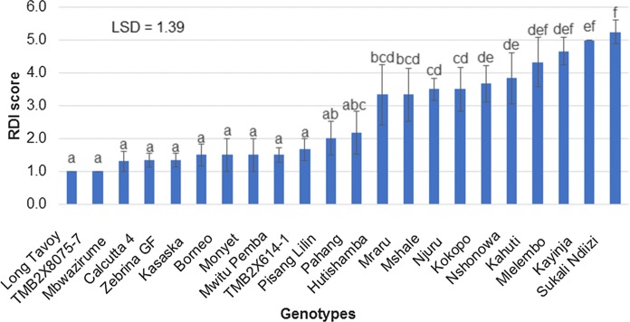 Fusarium wilt of bananas (Musa spp.), caused by Fusarium oxysporum f. sp. cubense (Foc) causes up to 100% yield loss in bananas. Foc race 1 in particular is very devastating to dessert bananas in Uganda. One of the effective control strategies for the disease is the development of resistant cultivars through breeding. The objectives of this study were to identify suitable banana germplasm for generating a segregating population for resistance to Foc race 1 and understand the mode of inheritance of resistance to Foc race 1. Twenty-two banana accessions sourced from the National Agricultural Research Organisation in Uganda were challenged with Foc race 1 in a screen house experiment. Monyet, resistant to Foc race 1 and Kokopo, susceptible, were selected and crossed to generate 142 F1 genotypes. These F1 genotypes were also challenged with Foc race 1 in a screen house experiment. Data were collected on rhizome discoloration index (RDI), leaf symptom index (LSI) and pseudo-stem splitting (PSS), and analysed for variability. The banana accessions evaluated showed varying degrees of resistance to Foc race 1. Segregation ratios for resistant versus susceptible progenies fitted 13:3 (χ2 = 0.12, P = 0.73) for RDI and 11:5 (χ2 = 3.04, P = 0.08) for PSS. Estimated broad sense heritability was 27.8% for RDI, 13.9% for LSI and 14.7% for PSS. The results suggest that resistance to Foc race 1 in banana is controlled by at least two dominant genes with epistatic interaction and that heritability of resistance to Foc race 1 is low in Musa spp.