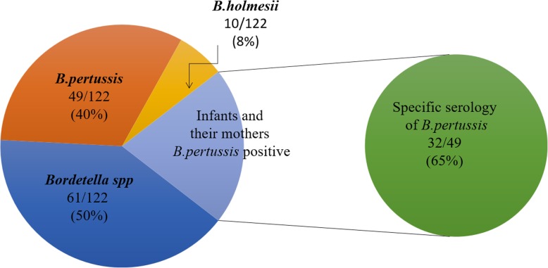 Results: During the study period, the survey was carried out on 128 infants hospitalized for pertussis suspicion and their families (N = 140). B. pertussis DNA was specifically detected in 73 (57%) samples, coexistence of B. pertussis and B. parapertussis DNA in 3 (2.3%) samples, coexistence of B. pertussis and B. holmesii DNA in 10 (7.81%) and only one (0.78%) sample was IS 481 RT-PCR positive without the possibility of determining the Bordetella species with the diagnostic tools used. Confirmations of Pertussis infection in household contacts by culture, RT- PCR and serology were 10, 46 and 39%, respectively. B. pertussis DNA was confirmed in the infants as well in their mothers in 38% of the cases. Co detection of B. pertussis and B. parapertussis DNA in 2% and co-detection of B. pertussis and B. holmesii DNA in 4%. B. holmesii DNA alone was detected in 5 NP samples of index cases and their mothers.