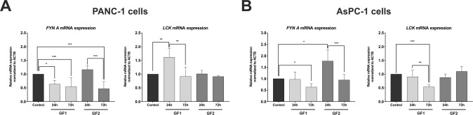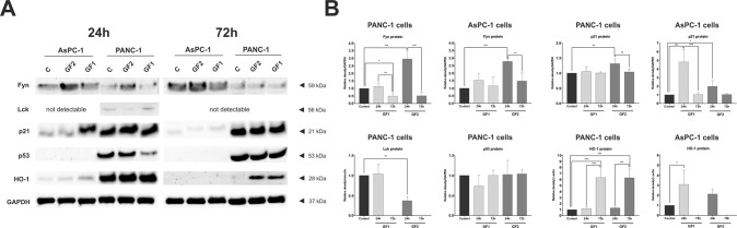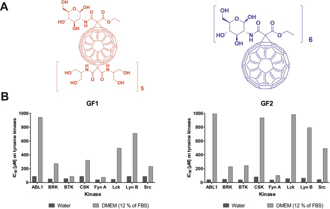 The water-soluble glycofullerenes GF1 and GF2 were synthesized using two-step modified Bingel-Hirsch methodology. Interestingly, we identified buckyballs as a novel class of non-receptor Src kinases inhibitors. The evaluated compounds were found to inhibit Fyn A and BTK proteins with IC50 values in the low micromolar range, with the most active compound at 39 µM. Moreover, we have demonstrated that formation of protein corona on the surface of [60]fullerene derivatives is changing the landscape of their activity, tuning the selectivity of obtained carbon nanomaterials towards Fyn A and BTK kinases. The performed molecular biology studies revealed no cytotoxicity and no influence of engineered carbon nanomaterials on the cell cycle of PANC-1 and AsPC-1 cancer cell lines. Incubation with the tested compounds resulted in the cellular redox imbalance triggering the repair systems and influenced the changing of protein levels.