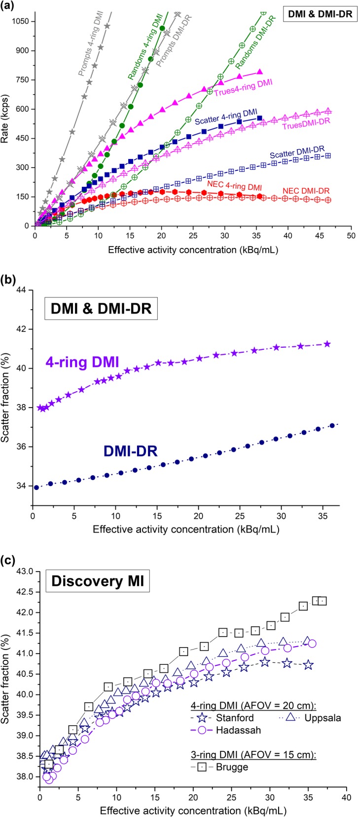 Conclusions: Performance measures were higher for the 4-ring DMI than the DMI-DR system. The biggest advantages of the 4-ring DMI vs DMI-DR are improved sensitivity and count rate performance. This should allow a better image signal-to-noise ratio (SNR) for the same acquisition times or, similar SNR with lower acquisition times or injected activity. In its 3-ring configuration, the DMI showed worse performance results than the PMT-based system in terms of count rate scatter fraction and image quality (for similar axial FOV).