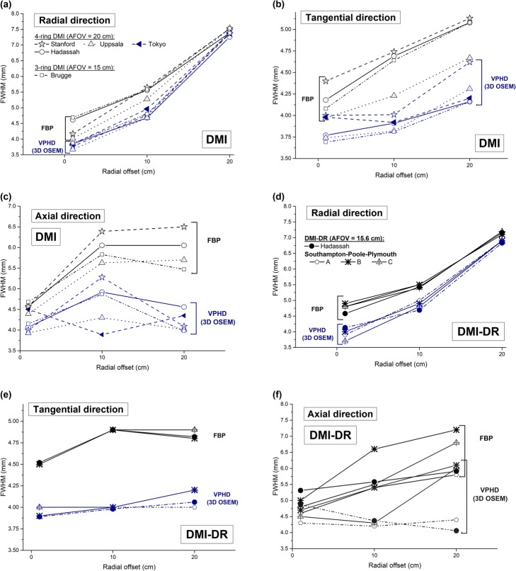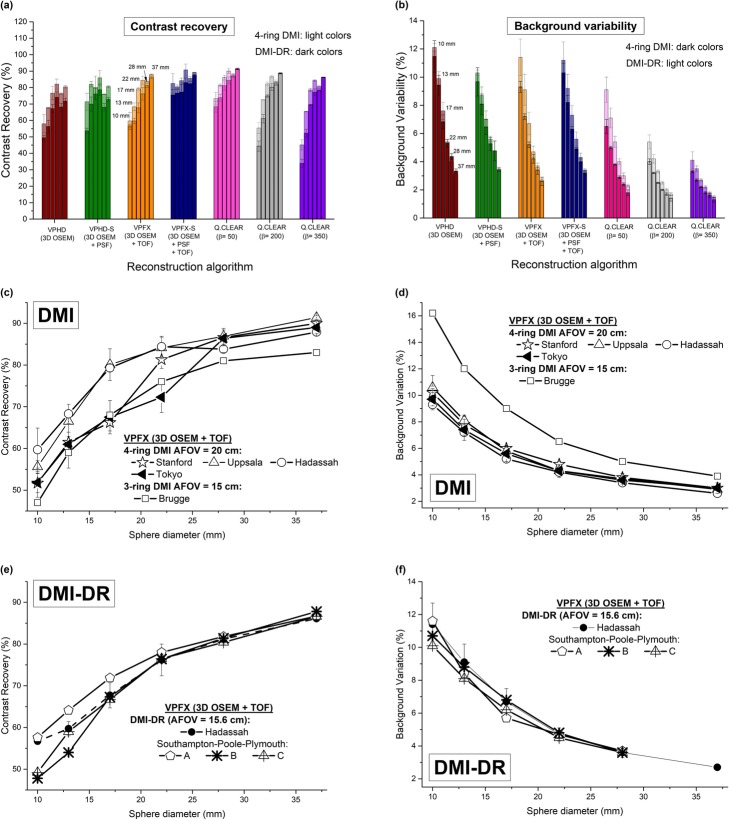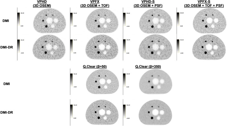 Results: 4-ring DMI spatial resolution at 1-cm radial offset in the radial, tangential and axial directions was 4.62, 4.18 and 4.57 mm, respectively, compared with the DMI-DR system values of 4.58, 4.52, and 5.31 mm. Measured sensitivity was 13.3 kcps/MBq at the center of the FOV and 13.4 kcps/MBq 10 cm off-center for the SiPM-based DMI system. DMI-DR system sensitivity was 6.3 kcps/MBq at the center of the FOV and 6.8 kcps/MBq at 10 cm off-center. DMI measured noise equivalent count rate peak was 175.6 kcps at 20.1 kBq/ml; DMI-DR was 146.7 kcps at 31.7 kBq/ml. Scatter fraction was 40.5% and 36.6%, respectively. DMI image contrast recovery (CR) values ranged from 73.2% (10 mm sphere) to 91.0% (37 mm sphere); DMI-DR, values ranged from 68.4% to 91.4%. DMI background variability (BV) was 1.8%-6.5%; DMI-DR was 2.3%-9.1%. The Q.Clear algorithm improved image quality, increasing CR and decreasing BV in both systems. The photopeak energy resolution was 9.63% and 12.19% for DMI and DMI-DR, respectively. The time-of-flight (TOF) resolution was 377.26 ps and 552.71 ps, respectively. Compared with measurements in other centers, results were similar and showed an absolute mean relative deviation of 6% for DMI and 7% for DMI-DR overall performance results.