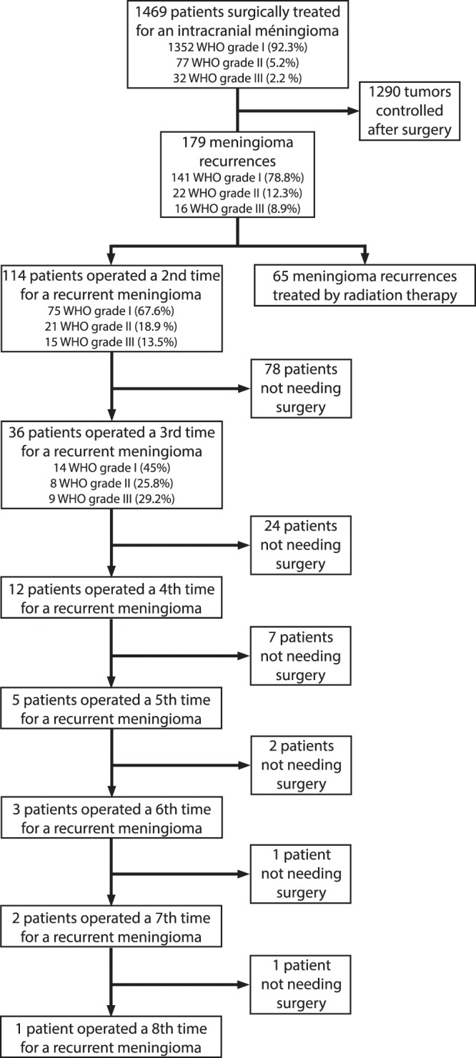 Meningiomas are the most common intracranial extra-axial tumor. While the literature is abundant on the therapeutic management of meningioma recurrence after the initial surgery, the natural history of repeated recurrences is poorly described, as well as and their respective management. A partly retrospective, partly prospective review was conducted in a Norwegian cohort of 1469 consecutive cases of meningioma surgically treated, totaling 11 414 patient-years of follow-up. 114 recurrences (7.7%) were treated surgically with a risk a surgical retreatment of 1% per patient-year of follow-up. 36 patients were operated on 3 times or more. The time-to-retreatment (TTR) decreased significantly and steadily between surgeries, from 4.3 ± 4 years after the first surgery to 2.4 ± 2.9 years after the third surgery. The primary driver for recurrence was the WHO grade (OR 7.13 [4.40;11.55], p < 0.001 for the first recurrence and OR 4.13 [1.49;12.15], p 0.008 for the second), the second predictive factor being a skull base location (OR 2.76 [1.95;3.99] p < 0.001 and OR 0.24 [0.09;0.65], p0.006 respectively). The rates of postoperative hematomas and infections were not influenced by the number of surgeries, whereas the rate of postoperative neurological worsening increased from 3.9% to 16.6% and 13.9%, respectively, after the first, second, and third surgeries. We observed that the TTR decreased significantly between surgeries in patients requiring repeated resections, indicating that surgical treatment of recurrences does not reset the clock but is indeed a "race against time". This should be considered when assessing the benefit-to-risk ratio of patients undergoing repeated surgeries for a recurrent meningioma.
