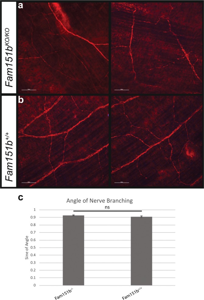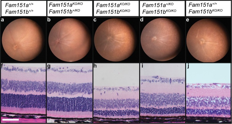 Fam151b is a mammalian homologue of the C. elegans menorin gene, which is involved in neuronal branching. The International Mouse Phenotyping Consortium (IMPC) aims to knock out every gene in the mouse and comprehensively phenotype the mutant animals. This project identified Fam151b homozygous knock-out mice as having retinal degeneration. We show they have no photoreceptor function from eye opening, as demonstrated by a lack of electroretinograph (ERG) response. Histological analysis shows that during development of the eye the correct number of cells are produced and that the layers of the retina differentiate normally. However, after eye opening at P14, Fam151b mutant eyes exhibit signs of retinal stress and rapidly lose photoreceptor cells. We have mutated the second mammalian menorin homologue, Fam151a, and homozygous mutant mice have no discernible phenotype. Sequence analysis indicates that the FAM151 proteins are members of the PLC-like phosphodiesterase superfamily. However, the substrates and function of the proteins remains unknown.