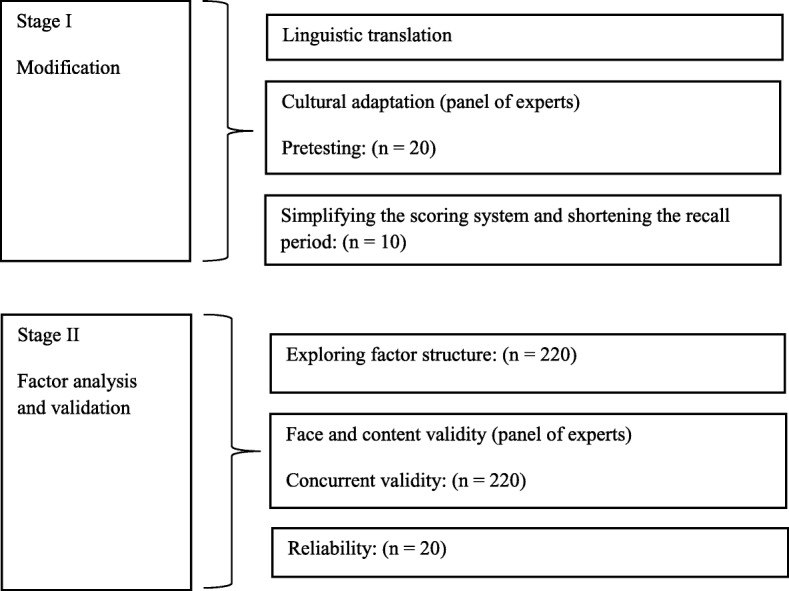 Methods: Stage I involved cultural adaptation of the tool through translation and modification. Stage II involved the exploring factor structure, validation and a reliability assessment. After translation and cultural adaptation, stage II was conducted among 220 secondary school students aged 15-19 in the Gampaha district, Sri Lanka. Participants completed the modified OIDP scale along with questions on self-reported perceived oral health problems and treatment need which were used to assesses the concurrent validity of the modified OIDP scale. Factorability was assessed by inspection of correlation matrix and Kaiser-Meyer-Olkin and Bartlett's Test of Sphericity tests as a measure of sampling adequacy. An exploratory factor analysis was carried out using Principal Component Analysis method and factors were rotated using the oblimin method.