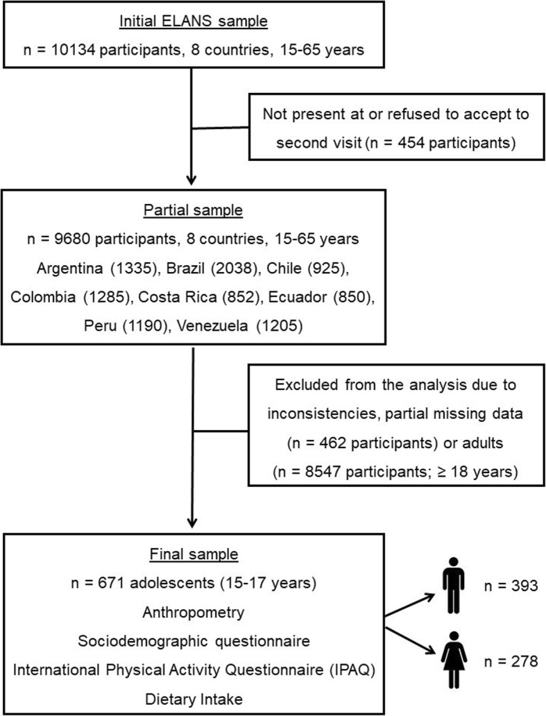 Methods: Six hundred seventy-one adolescents (41.4% girls) from the Latin American Study of Nutrition and Health (ELANS) were included. Nutritional status was classified by four BMI (kg/m2) categories. Waist circumference (WC) was categorized as above or below thresholds. Dietary intake was assessed through two non-consecutive 24-h dietary recalls. PA and ST were measured using the International Physical Activity Questionnaire (IPAQ). We calculated overall and country-specific estimates by sex and tested for differences between boys and girls.