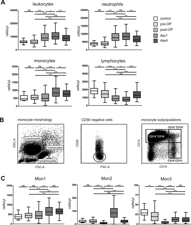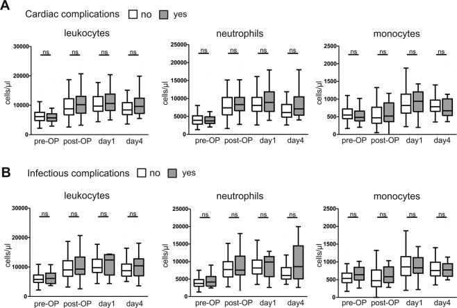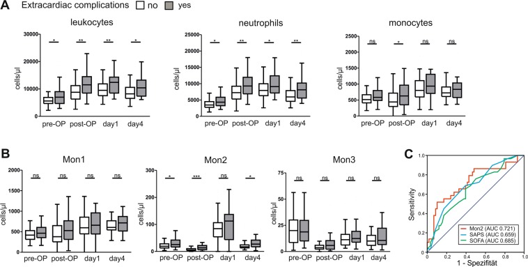 Elective cardiac surgery has low procedural complications. However, about 40% of patients develop extracardiac complications including delirium and acute kidney injury. We hypothesized that inflammatory processes and immune cell activation might be associated with these complications. We therefore prospectively included 104 patients undergoing cardiac surgery in our study. We assessed peripheral blood leukocyte populations by flow cytometry and circulating cytokines before operation, after surgery and at days one and four post-operatively. Patients undergoing cardiac surgery showed significantly elevated leukocytes and neutrophils after surgery. On the contrary, monocytes decreased after surgery and significantly increased at days 1 and 4, particularly classical (Mon1,CD14++CD16-) and intermediate (Mon2,CD14++CD16+) monocytes. While peripheral leukocyte subsets were unaltered in patients with infectious (n = 15) or cardiac complications (n = 31), post-operative leukocytes (p = 0.0016), neutrophils (p = 0.0061) and Mon2 (p = 0.0007) were clearly raised in patients developing extracardiac complications (n = 35). Using multiple logistic regression analyses, patient's age, ICU days, number of blood transfusions and elevated post-surgery Mon2 independently predicted extracardiac complications. Our findings demonstrate that elevated Mon2 after cardiac surgery are associated with an increased risk for extracardiac complications. These findings might improve the risk estimation after cardiac operations and the role of Mon2 for inflammation in cardiac surgery.
