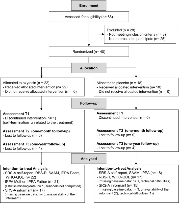 Results: No treatment-specific effects were identified in the primary outcome assessing social symptoms (Social Responsiveness Scale, self- and informant-rated). In particular, with respect to self-reported social responsiveness, improvements were evident both in the oxytocin and in the placebo group, yielding no significant between-group difference (p = .37). Also informant-rated improvements in social responsiveness were not significantly larger in the oxytocin, compared to the placebo group (between-group difference: p = .19). Among the secondary outcome measures, treatment-specific improvements were identified in the Repetitive Behavior Scale and State Adult Attachment Measure, indicating reductions in self-reported repetitive behaviors (p = .04) and reduced feelings of avoidance toward others (p = .03) in the oxytocin group compared to the placebo group, up to 1 month and even 1 year post-treatment. Treatment-specific effects were also revealed in screenings of mood states (Profile of Mood States), indicating higher reports of "vigor" (feeling energetic, active, lively) in the oxytocin, compared to the placebo group (p = .03).