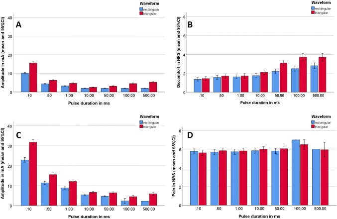 Results: Discomfort at motor threshold was significantly lower for rectangular than for triangular pulses. Average motor and tolerability thresholds were higher for patients than for healthy participants. Discomfort at motor threshold was significantly lower for healthy controls compared to patients. Major side effects were not seen.