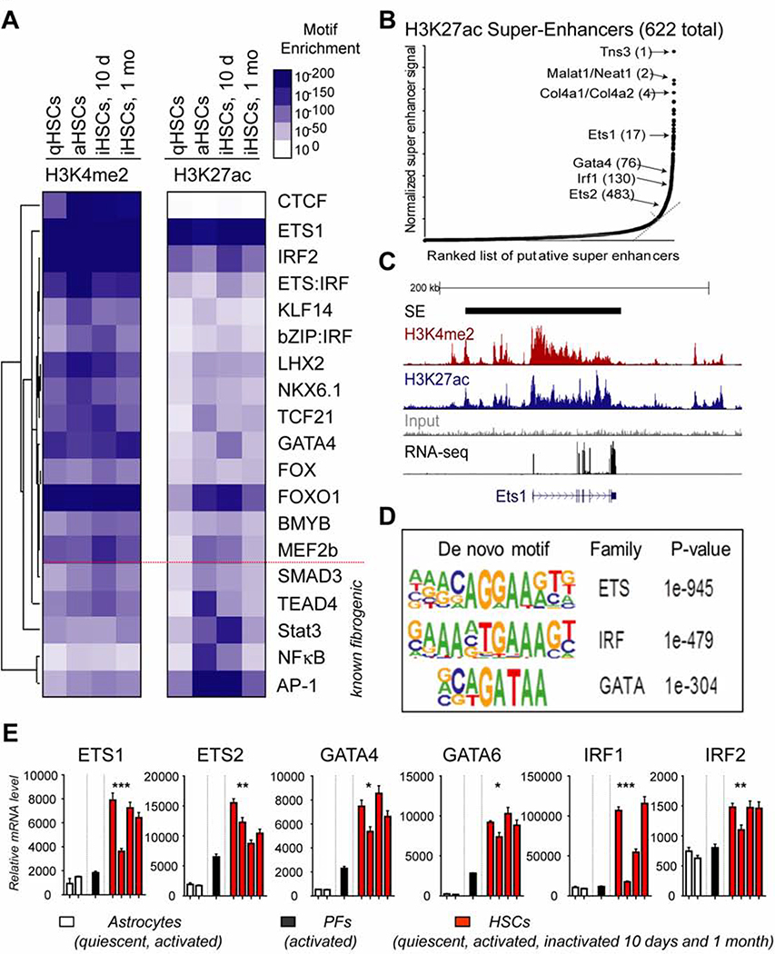 Methods: We performed studies with LratCre, Ets1-floxed, Nf1-floxed, Pparγ-floxed, Gata6-floxed, Rag2-/-γc-/-, and C57/Bl6 (control) mice. Some mice were given carbon tetrachloride (CCl4) to induce liver fibrosis, with or without a peroxisome proliferator-activated receptor-γ (PPARγ) agonist. Livers from mice were analyzed by immunohistochemistry. Quiescent, activated, and inactivated HSCs were isolated from livers of Col1α1YFP mice and analyzed by chromatin immunoprecipitation and sequencing. Human HSCs were isolated from livers denied for transplantation. We compared changes in gene expression patterns and epigenetic modifications (histone H3 lysine 4 dimethylation and histone H3 lysine 27 acetylation) in primary mouse and human HSCs. Transcription factors were knocked down with small hairpin RNAs in mouse HSCs.