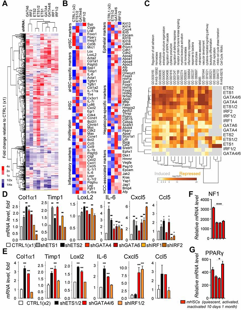 Results: Motif enrichment identified E26 transcription-specific transcription factors (ETS) 1, ETS2, GATA4, GATA6, interferon regulatory factor (IRF) 1, and IRF2 transcription factors as regulators of the mouse and human HSC lineage. Small hairpin RNA-knockdown of these transcription factors resulted in increased expression of genes that promote fibrogenesis and inflammation, and loss of HSC phenotype. Disruption of Gata6 or Ets1, or Nf1 or Pparγ (which are regulated by ETS1), increased the severity of CCl4-induced liver fibrosis in mice compared to control mice. Only mice with disruption of Gata6 or Pparγ had defects in fibrosis resolution after CCl4 administration was stopped, associated with persistent activation of HSCs. Administration of a PPARγ agonist accelerated regression of liver fibrosis after CCl4 administration in control mice but not in mice with disruption of Pparγ.