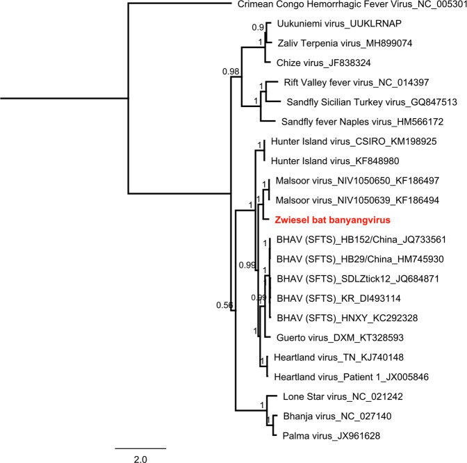 Bats are reservoir hosts for several emerging and re-emerging viral pathogens causing morbidity and mortality in wildlife, animal stocks and humans. Various viruses within the family Phenuiviridae have been detected in bats, including the highly pathogenic Rift Valley fever virus and Malsoor virus, a novel Banyangvirus with close genetic relation to Huaiyangshan banyangvirus (BHAV)(former known as Severe fever with thrombocytopenia syndrome virus, SFTSV) and Heartland virus (HRTV), both of which have caused severe disease with fatal casualties in humans. In this study we present the whole genome of a novel Banyangvirus, named Zwiesel bat banyangvirus, revealed through deep sequencing of the Eptesicus nilssonii bat virome. The detection of the novel bat banyangvirus, which is in close phylogenetic relationship with the pathogenic HRTV and BHAV, underlines the possible impact of emerging phenuiviruses on public health.