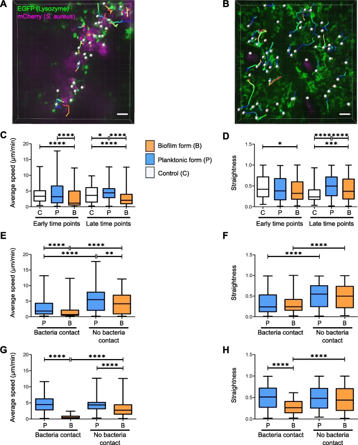 Results: We propose an in vivo transgenic mouse model, used in conjunction with intravital confocal microscopy to study the dynamics of host inflammatory responses to bacteria. Culture conditions were created to prepare calibrated inocula of fluorescent planktonic and biofilm forms of bacteria. A confocal imaging acquisition and analysis protocol was then drawn up to study the recruitment of innate immune cells in the skin of LysM-EGFP transgenic mice. Using the mouse ear pinna model, we showed that inflammatory responses to S. aureus can be quantified over time and that the dynamics of innate immune cells after injection of either the planktonic or biofilm form can be characterized. First results showed that the ability of phagocytic cells to infiltrate the injection site and their motility is not the same in planktonic and biofilm forms of bacteria despite the cells being considerably recruited in both cases.