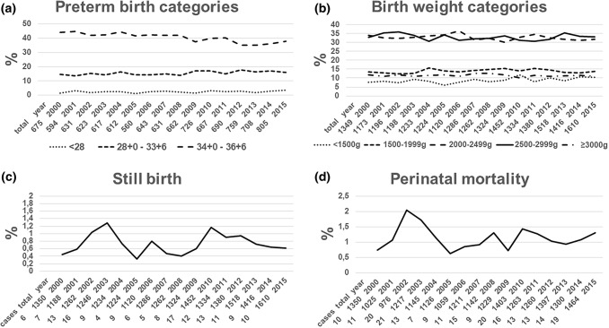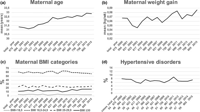 Results: The rate of twin pregnancies increased from 1.5 to 1.9% (p < 0.00001). Mean maternal age and pre-pregnancy weight rose from 31.4 to 32.9 years and from 68.2 to 71.2 kg, respectively (p < 0.001). The rates of women with a body mass index ≥ 30 kg/m2 increased from 11.9 to 16.9% with a mean of 24.4-25.4 kg/m2 (p < 0.001). The overall increase of maternal weight/week was 568 g, the 25th quartile was 419, the 75th quartile 692 g/week. The total and secondary caesareans increased from 68.6 to 73.3% and from 20.6 to 39.8%, respectively (p < 0.001). Rates of birthweight < 1500 g and of preterm birth < 28 and from 28 to 33 + 6 weeks all increased (p < 0.01). No significant changes were observed in the rates of stillbirth, perinatal mortality and NICU admissions.