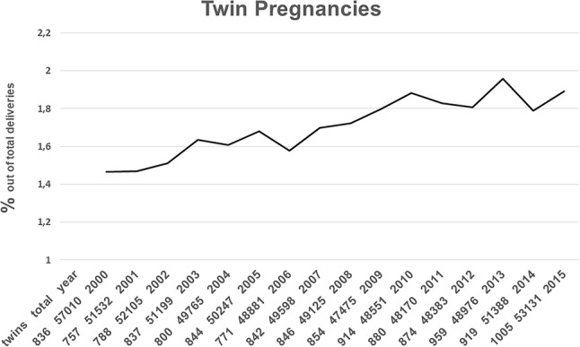 Methods: Data from 10,603/13,725 total twin pregnancies from the perinatal database in Hessen, Germany between 2000 and 2015 were used after exclusion of incomplete or non-plausible data sets. The course of maternal and perinatal outcomes was evaluated by linear and logistic regression models.