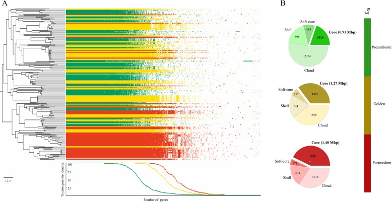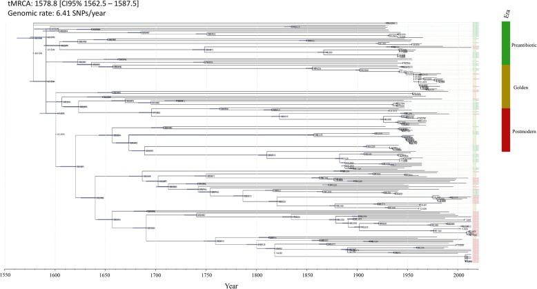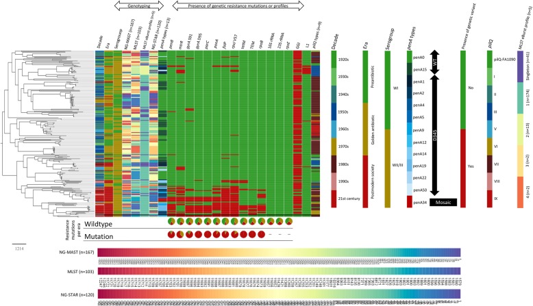 Conclusions: WGS of gonococci from 1928 to 2013 showed that no AMR determinants, except penB, were in detectable frequency before the introduction of gonorrhoea therapeutic antimicrobials. The modern gonococcus is substantially younger than previously hypothesized and has been evolving into a more clonal species, driven by the use/misuse of antimicrobials. The MDR gonococcal clade should be further investigated for early detection of strains with predispositions to develop and maintain MDR and for initiation of public health interventions.