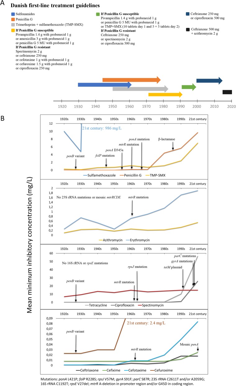 Results: Gonococcal AMR, including an accumulation of multiple AMR determinants, started to emerge particularly in the 1950s-1970s. By the twenty-first century, resistance to most antimicrobials was common. Despite that some AMR determinants affect many physiological functions and fitness, AMR determinants were mainly selected by the use/misuse of gonorrhoea therapeutic antimicrobials. Most AMR developed in strains belonging to one multidrug-resistant (MDR) clade with close to three times higher genomic mutation rate. Modern N. gonorrhoeae was inferred to have emerged in the late-1500s and its genome became increasingly conserved over time.
