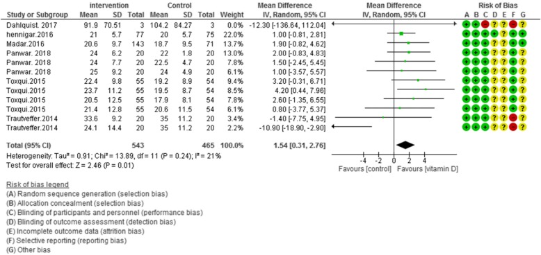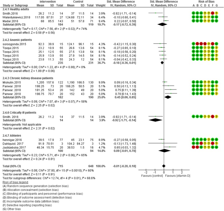 Results: Fourteen RCTs met the inclusion criteria. Current study findings propose that vitamin D supplementation leads to a non-significant reduction in hemoglobin levels in subjects (17.5-68 years old) [std. mean difference (SMD): 0.01; 95% CI: - 0.28, 0.29; P = 0.95], also it has no significant effect on ferritin concentrations [std. mean difference (SMD): -0.01; 95% CI: [- 0.20, 0.18; P = 0.91]. However, vitamin D supplementation demonstrated positive effects on transferrin saturation [mean difference (MD): 1.54; 95% CI: 0.31, 2.76; P = 0.01] and iron status [std. mean difference (SMD): 0.24; 95% CI: - 0.09, 0.39; P = 0.002].