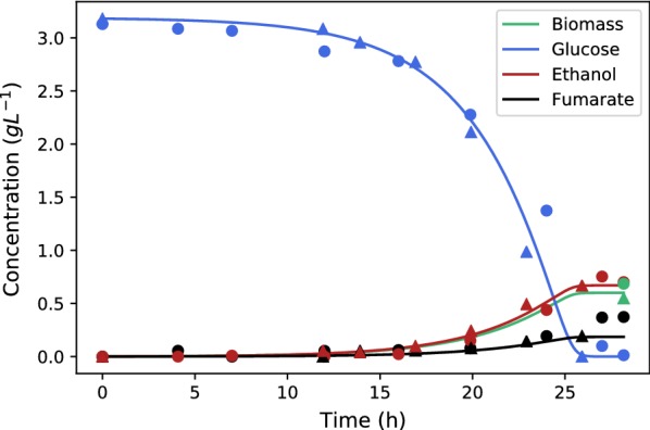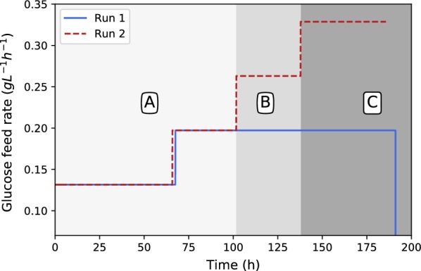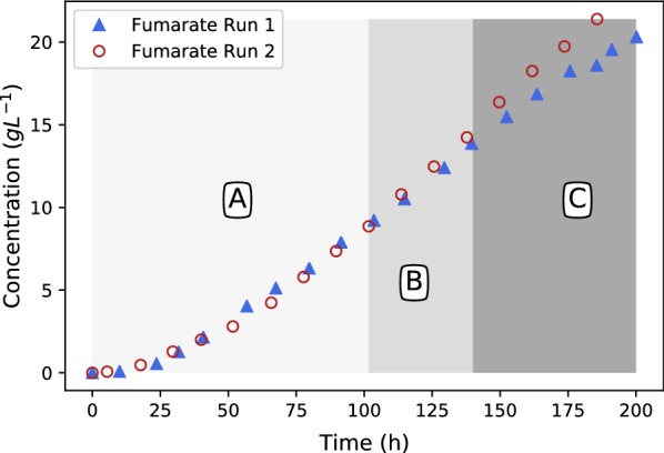 Results: All fermentations were performed with either nitrogen excess (growth phase) or nitrogen limitation (production phase) where medium replacements were done between the growth and the production phase. Initial experiments employed excess glucose for both growth and production, while the oxygen partial pressure was varied between a dissolved oxygen of 18.4% and 85%. Ethanol was formed during both growth and production phases and the oxygen partial pressure had zero influence on the response. Results clearly indicated that possible anaerobic zones within the mycelium were not responsible for ethanol formation, hinting that ethanol is formed under fully aerobic conditions as a metabolic overflow product. For Crabtree-positive organisms like Saccharomyces cerevisiae ethanol overflow is manipulated by controlling the glucose input to the fermentation. The same strategy was employed for R. oryzae for both growth and production fermentations. It was shown that all ethanol can be eliminated during growth for a glucose addition rate of . The production phase behaved in a similar manner, where glucose addition of resulted in fumarate production of and a yield of fumarate on glucose. Further investigation into the effect of glucose addition revealed that ethanol overflow commences at a glucose addition rate of on biomass, while the maximum glucose uptake rate was established to be between 0.426 and .