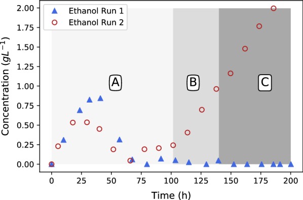 Background: The four-carbon dicarboxylic acids of the tricarboxylic acid cycle (malate, fumarate and succinate) remain promising bio-based alternatives to various precursor chemicals derived from fossil-based feed stocks. The double carbon bond in fumarate, in addition to the two terminal carboxylic groups, opens up an array of downstream reaction possibilities, where replacement options for petrochemical derived maleic anhydride are worth mentioning. To date the most promising organism for producing fumarate is Rhizopus oryzae (ATCC 20344, also referred to as Rhizopus delemar) that naturally excretes fumarate under nitrogen-limited conditions. Fumarate excretion in R. oryzae is always associated with the co-excretion of ethanol, an unwanted metabolic product from the fermentation. Attempts to eliminate ethanol production classically focus on enhanced oxygen availability within the mycelium matrix. In this study our immobilised R. oryzae process was employed to investigate and utilise the Crabtree characteristics of the organism in order to establish the limits of ethanol by-product formation under growth and non-growth conditions.
