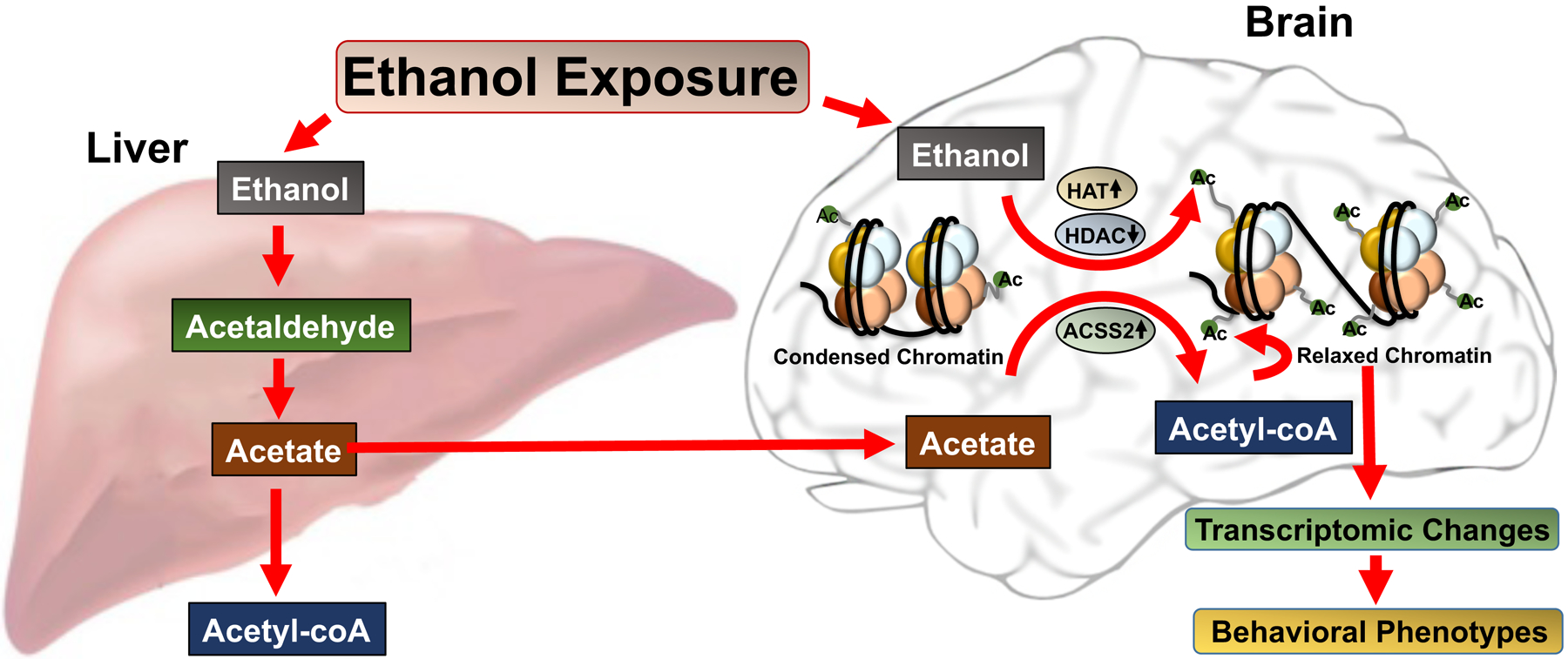 The toxic effects of alcohol consumption are dependent upon its metabolism in the liver to downstream metabolites: acetaldehyde, acetate, and acetyl-CoA. Recently, in Nature, Mews et al. (2019) have discovered that acetyl-CoA derived from alcohol plays an important epigenetic role in regulating ethanol's effects on the brain through histone acetylation.