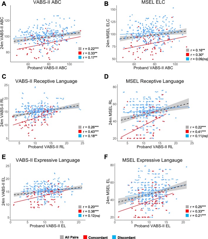 Methods: Participants included 385 pairs of toddler siblings and probands from the Infant Brain Imaging Study. ASD probands (mean age 5.5 years, range 1.7 to 15.5 years) were phenotyped using the Autism Diagnostic Interview-Revised (ADI-R), the Social Communication Questionnaire (SCQ), and the Vineland Adaptive Behavior Scales, Second Edition (VABS-II). Siblings were assessed using the ADI-R, VABS-II, Mullen Scales of Early Learning (MSEL), and Autism Diagnostic Observation Schedule (ADOS) and received a clinical best estimate diagnosis at 24 months using DSM-IV-TR criteria (n = 89 concordant for ASD; n = 296 discordant). We addressed two aims: (1) to determine whether proband characteristics are predictive of recurrence in siblings and (2) to assess associations between proband traits and sibling dimensional outcomes at 24 months.