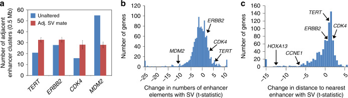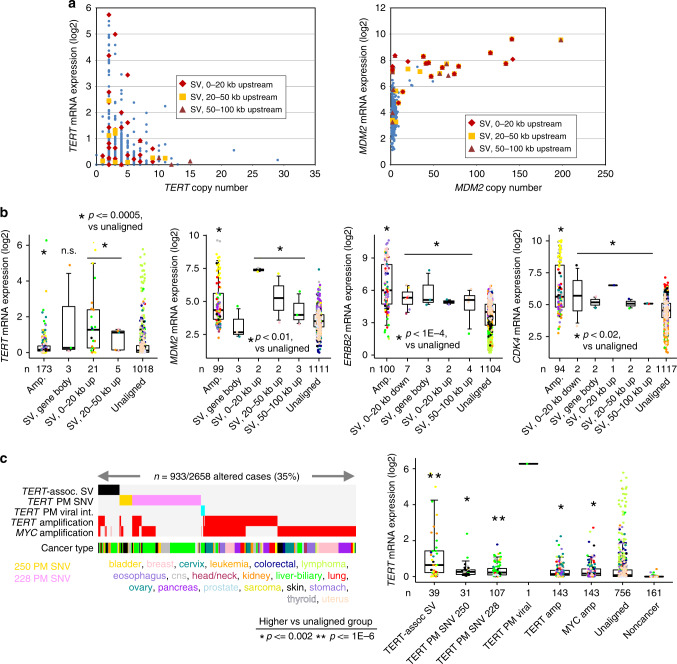 The impact of somatic structural variants (SVs) on gene expression in cancer is largely unknown. Here, as part of the ICGC/TCGA Pan-Cancer Analysis of Whole Genomes (PCAWG) Consortium, which aggregated whole-genome sequencing data and RNA sequencing from a common set of 1220 cancer cases, we report hundreds of genes for which the presence within 100 kb of an SV breakpoint associates with altered expression. For the majority of these genes, expression increases rather than decreases with corresponding breakpoint events. Up-regulated cancer-associated genes impacted by this phenomenon include TERT, MDM2, CDK4, ERBB2, CD274, PDCD1LG2, and IGF2. TERT-associated breakpoints involve ~3% of cases, most frequently in liver biliary, melanoma, sarcoma, stomach, and kidney cancers. SVs associated with up-regulation of PD1 and PDL1 genes involve ~1% of non-amplified cases. For many genes, SVs are significantly associated with increased numbers or greater proximity of enhancer regulatory elements near the gene. DNA methylation near the promoter is often increased with nearby SV breakpoint, which may involve inactivation of repressor elements.