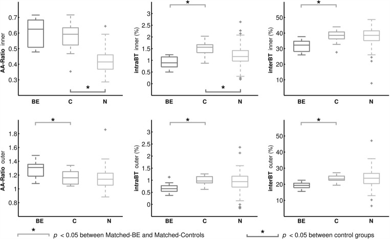 Results: Control subjects showed intra-branch tapering of 1% and inter-branch tapering of 24-39%. Subjects with bronchiectasis showed significantly reduced intra-branch of 0.8% and inter-branch tapering of 19-32% and increased airway-artery ratios compared with controls (p < 0.01). Tapering measurements were significantly different between diseased and controls across all airway sizes. Difference in airway-artery ratio was only significant in small airways.