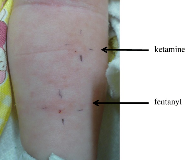 Case presentation: A 2-month-old male was scheduled to undergo a Blalock-Taussig shunt. Following uneventful anesthetic induction, he experienced profound hypotension and generalized erythema. Anaphylaxis was clinically diagnosed, and he was treated with epinephrine, vasopressin, and fluids. The surgery was canceled, and he was transferred to the intensive care unit after restoration of his hemodynamic status. Intradermal testing was performed for all of the drugs given during the anaphylactic event on postoperative day (POD) 3. The results showed a positive reaction to fentanyl. For the second anesthesia scheduled on POD 5, morphine sulfate was selected as an alternative opioid. Anesthesia was maintained uneventfully with sevoflurane, morphine, and rocuronium.