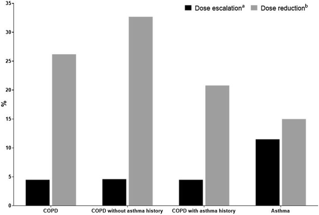 Results: During 2014-2015, 4373 patients initiated FF/VI: 3380 on FF/VI 100/25 (65% in the COPD diagnosis group) and 993 on FF/VI 200/25 (51% in the asthma diagnosis group). During up to 12 months of follow-up, the median number (interquartile range) of prescriptions of the index strength issued per patient was 7 (2-8) for FF/VI 100/25 and 5 (2-8) for FF/VI 200/25; most new users did not change from the index strength prescribed (93.0% COPD; 89.7% asthma, of all patients initiating treatment with FF/VI). Potential off-label FF/VI prescribing in children < 12 years old was rare (< 0.29% in the combined asthma and other diagnosis groups), and up to one in five new users of FF/VI with COPD were potentially prescribed FF/VI 200/25 off-label during the study period. Much of the potential off-label prescribing in COPD occurred in patients with a history of asthma, those presenting with greater disease severity, and/or prior treatment with high-dose steroids.