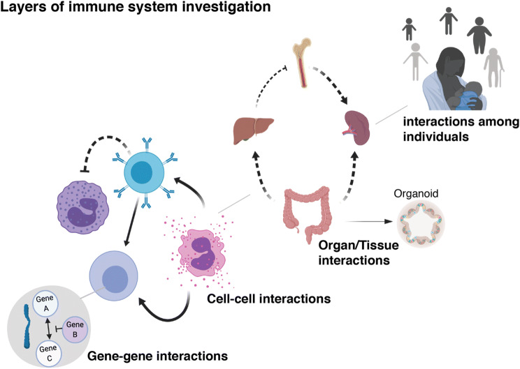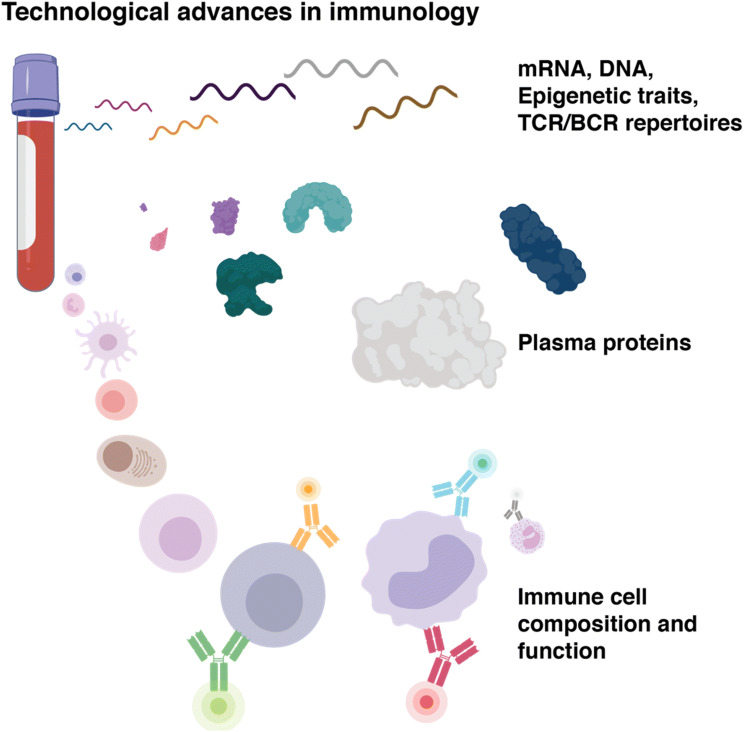 The human immune system consists of multiple, layered mechanisms of sensing and responding to cellular stress, infection and tissue damage to ensure defense from pathogens, maintenance of tissue homeostasis, and the integrity of the holobiont. Every single cell in the body has a role to play, but a few dozen, specialized white blood cells are particularly important in this respect. Understanding the overall state of this multifaceted system in a single individual is challenging, and we are only beginning to do this across populations of individuals, to understand the vast range of inter-individual variation, and the influences of genes and environmental factors that collectively shape the immune system in a given individual. We are also only beginning to understand the changes occurring within this system over time, and how this relates to health and disease susceptibility. Several technological breakthroughs in recent years have enabled these developments and the emergence of a new, complementary approach to studying human immune systems, namely systems immunology. In this paradigm, the focus is shifted from the understanding of individual immune system components and their mechanisms of action, towards analyses of cell-cell interactions, and mechanisms of coordination and regulation within the human immune system.