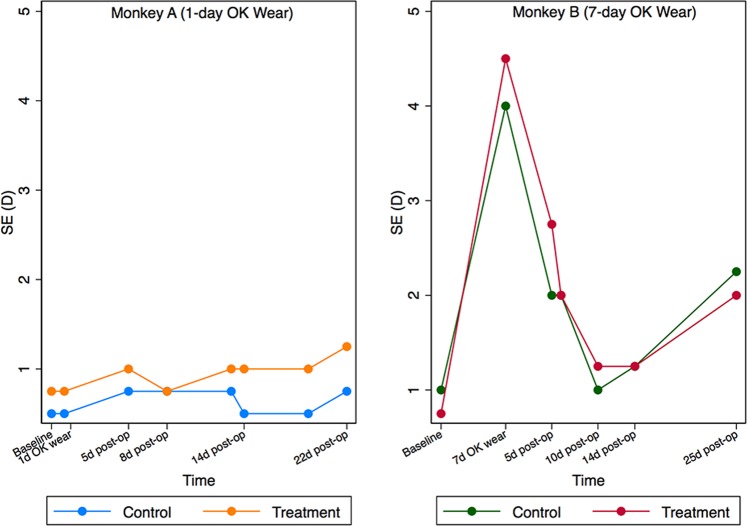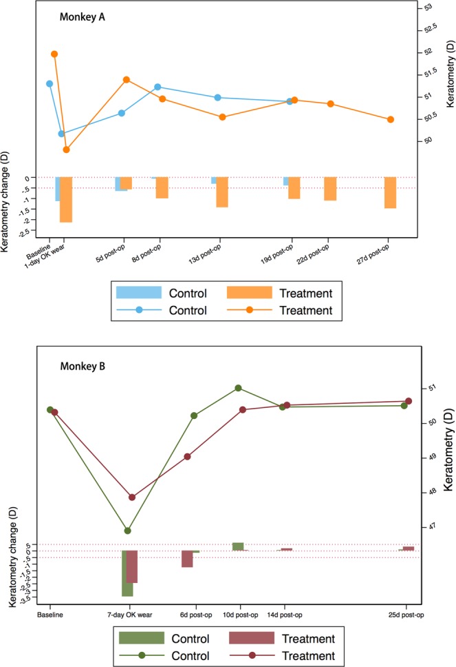 Orthokeratology (Ortho-K) works to reshape cornea and is the only non-surgical way to enable vision without corrective aids. However, its effect is only temporary, and successful stabilization requires ongoing Ortho-K wear to maintain the reshaping effect. Corneal crosslinking (CXL) is a commonly-used technique in clinical practice to stabilize corneal shape in keratoconic eyes. However, whether or not CXL can stabilize corneal shape after Ortho-K in normal cornea has not been reported. Therefore, this proof-of-concept study using 2 rhesus monkeys aimed to determine the efficacy of the combined procedure. One monkey wore Ortho-K bilaterally for 24 hours, and the other from 6 pm to 8 am for 7 days. The left eyes of both monkeys underwent CXL after Ortho-K while the contralateral eye served as control. Results showed a gradual regression of corneal shape in all eyes with or without CXL. However, eyes underwent CXL regressed more slowly than the control eyes. The control eyes and the CXL treatment eye in the 7-day Ortho-K monkey regressed completely at last, while the CXL treatment eye in the 24 h Ortho-K monkey maintained a corneal flattening of -1.48 D 27 days after procedure. These findings suggest CXL can slow the regression of Ortho-K for a short duration, but cannot sustain its effect according to the current protocol.
