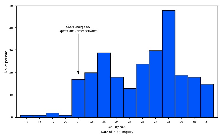 In December 2019, a cluster of cases of pneumonia emerged in Wuhan City in central China's Hubei Province. Genetic sequencing of isolates obtained from patients with pneumonia identified a novel coronavirus (2019-nCoV) as the etiology (1). As of February 4, 2020, approximately 20,000 confirmed cases had been identified in China and an additional 159 confirmed cases in 23 other countries, including 11 in the United States (2,3). On January 17, CDC and the U.S. Department of Homeland Security's Customs and Border Protection began health screenings at U.S. airports to identify ill travelers returning from Wuhan City (4). CDC activated its Emergency Operations Center on January 21 and formalized a process for inquiries regarding persons suspected of having 2019-nCoV infection (2). As of January 31, 2020, CDC had responded to clinical inquiries from public health officials and health care providers to assist in evaluating approximately 650 persons thought to be at risk for 2019-nCoV infection. Guided by CDC criteria for the evaluation of persons under investigation (PUIs) (5), 210 symptomatic persons were tested for 2019-nCoV; among these persons, 148 (70%) had travel-related risk only, 42 (20%) had close contact with an ill laboratory-confirmed 2019-nCoV patient or PUI, and 18 (9%) had both travel- and contact-related risks. Eleven of these persons had laboratory-confirmed 2019-nCoV infection. Recognizing persons at risk for 2019-nCoV is critical to identifying cases and preventing further transmission. Health care providers should remain vigilant and adhere to recommended infection prevention and control practices when evaluating patients for possible 2019-nCoV infection (6). Providers should consult with their local and state health departments when assessing not only ill travelers from 2019-nCoV-affected countries but also ill persons who have been in close contact with patients with laboratory-confirmed 2019-nCoV infection in the United States.